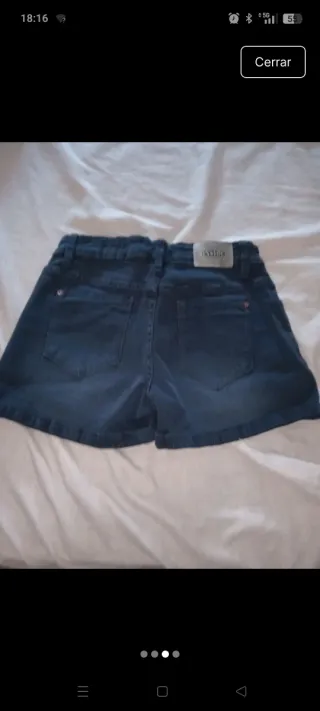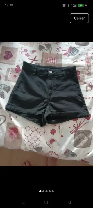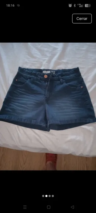 Pantalón vaquero corto de tela vaquera. - Cintura alta. - Bolsillos delanteros y traseros. - Cierre de cremallera y botón.
