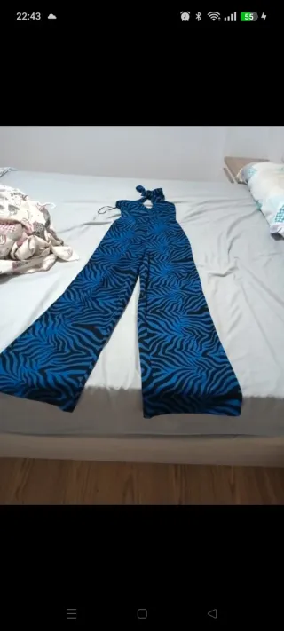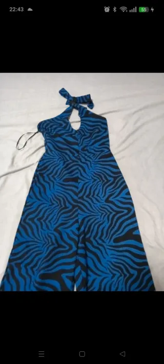 Mono largo con un llamativo estampado de cebra en tonos azules y negros. Tiene un diseño sin mangas y atado al cuello. - Diseño sin mangas. - Cierre con lazada en el cuello. - Piernas anchas.