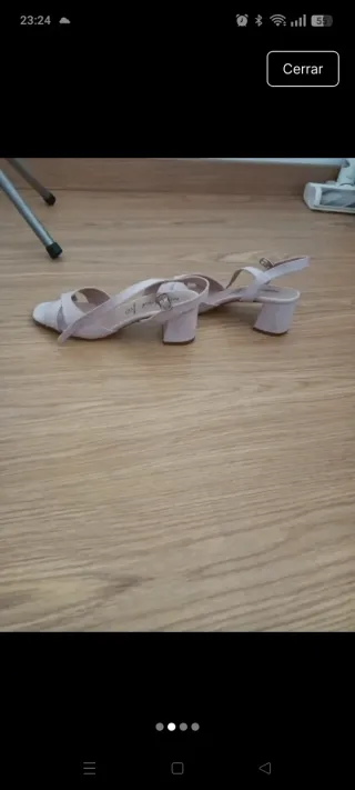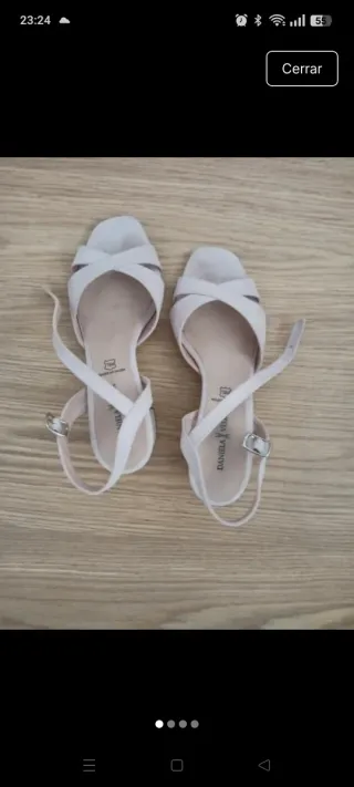 Sandalias de tiras cruzadas en color beige. - Diseño elegante con hebilla. - Usadas un par de veces -Tira ajustable al tobillo - Tacón prqueño