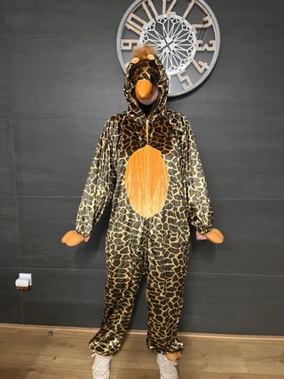 Disfraz tipo pijama de jirafa para mujer. - Diseño de jirafa con estampado de manchas. - Cierre frontal con cremallera. - Capucha con detalles de jirafa. - Talla L.