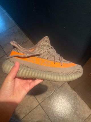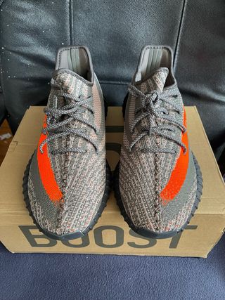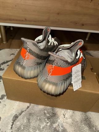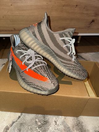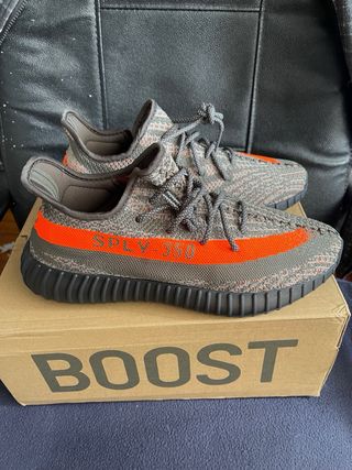 Zapatillas Adidas Yeezy Boost 350 V2. - Modelo Beluga. - Tallas disponibles: 45, 45, 43, 42 2/3, 41, 41, 38. - Combinación de colores gris y naranja.