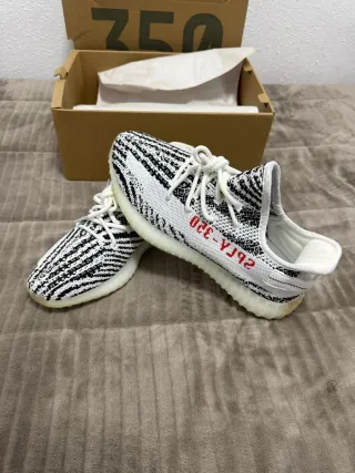 Zapatillas Adidas Yeezy Boost 350 V2 con el icónico diseño Zebra. - Patrón de rayas blancas y negras. - Mediasuela Boost para mayor comodidad. - Detalles en rojo. - Talla 44.