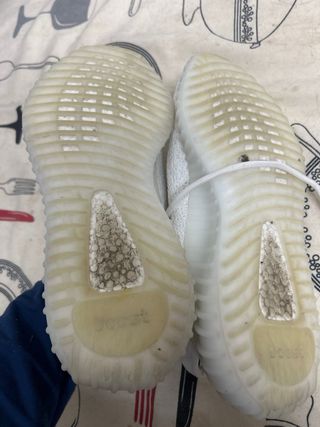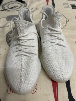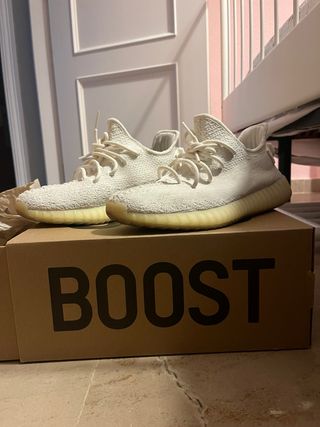 Zapatillas Adidas Yeezy Boost 350 V2 en color blanco. Puestas un par de veces la puntera tiene alguna mancha del uso - Diseño moderno y cómodo. - Parte superior de tejido Primeknit. - Suela de goma. - Cordones blancos.