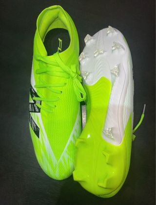 Zapatillas de fútbol New Balance en llamativo color verde con detalles blancos. - Diseño moderno y llamativo. - Cordones a juego con el color principal.