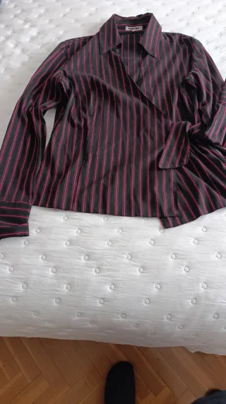 Camisa de Topshop con un diseño de rayas verticales. - Color base negro con rayas Morada - Corte cruzado con lazada. - Mangas largas con puños abotonados.