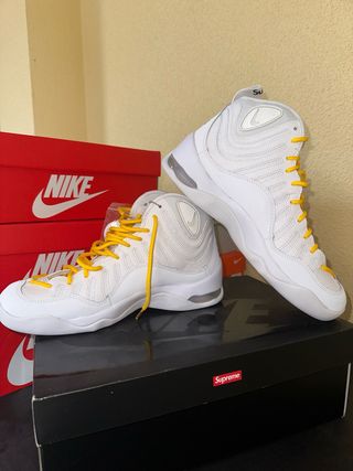 Zapatillas altas Nike Supreme Bakin talla 44. - Diseño en blanco con detalles en amarillo. - Cordones amarillos. - Suela con amortiguación visible.