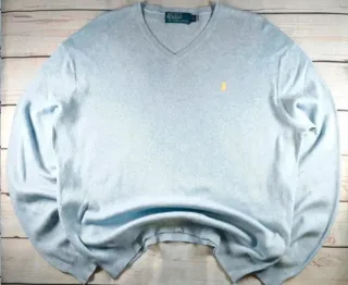 Jersey de punto "Polo by Ralph Lauren" original en un elegante color azul celeste melange. Es una prenda clásica, versátil y de alta calidad, ideal para un look casual o de oficina. Corte: Cuello en V (pico). Detalle: Logotipo del "pony" bordado en color amarillo suave en el pecho. Estado: En muy buen estado, bien cuidado. Talla: L (Grande). Autenticidad: Incluye etiquetas interiores de Ralph Lauren Europe (Suiza) que garantizan su originalidad.