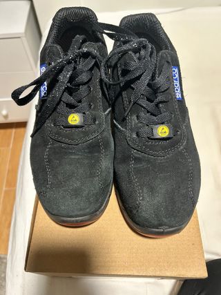 Botas de seguridad Sparco en buen estado. Usadas durante una semana en un almacen con una plantilla de pies propia. - Material exterior de ante. - Cierre con cordones. - Suela de goma. - Diseño unisex.