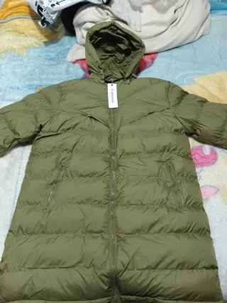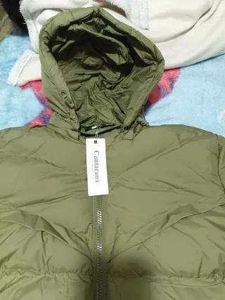 Abrigo tipo plumífero en color verde, nuevo a estrenar. - Diseño acolchado. - Capucha integrada. - Cierre de cremallera frontal. - Bolsillos laterales con cremallera.