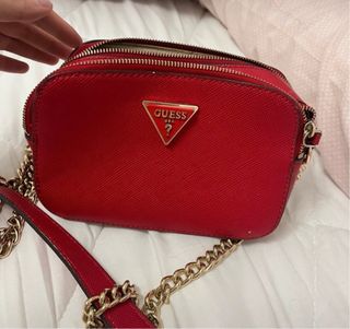 Bolso de la marca Guess en color rojo. - Diseño elegante y moderno. - Cadena dorada para llevar al hombro o cruzado. - Cierre de cremallera. - Logo de Guess en la parte frontal.