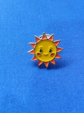 Este pin tiene la forma de un sol sonriente con detalles en naranja y amarillo. - Diseño divertido y alegre. - Ideal para personalizar ropa o mochilas.