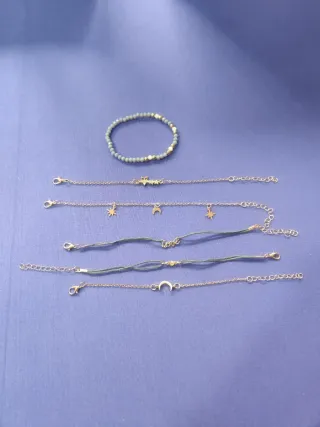 Conjunto de cinco pulseras con estilo boho. - Pulsera de cuentas grises y detalles dorados. - Pulsera con colgantes de estrellas. - Pulsera con la palabra love. - Pulsera con un pequeño detalle dorado. - Pulsera con colgante de luna creciente.
