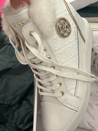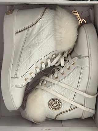 Zapatillas altas de la marca Guess en color blanco con detalles dorados y un suave adorno de pelo. - Diseño acolchado con el logo de Guess. - Cierre de cordones. - Adorno de pelo en la parte superior. - Detalles metálicos dorados.