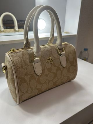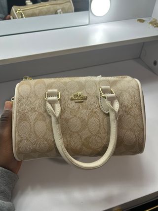 Bolso de mano estilo barril con el icónico estampado de la marca. - Color beige con detalles dorados. - Asa corta para llevar en la mano.