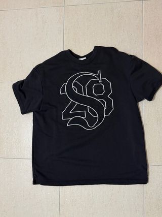 Camiseta negra con un llamativo diseño gráfico. - Diseño frontal con contorno blanco. - Cuello redondo. - Manga corta.