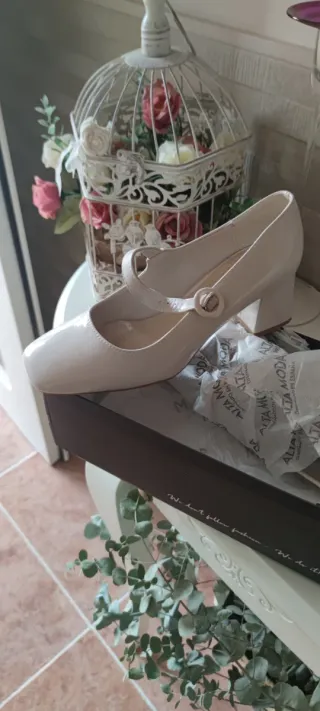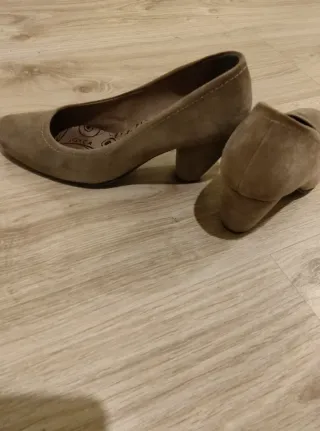 Elegantes zapatos de tacón de piel. - Color beige/marrón. - Marca: Joyca. - Tacón grueso.