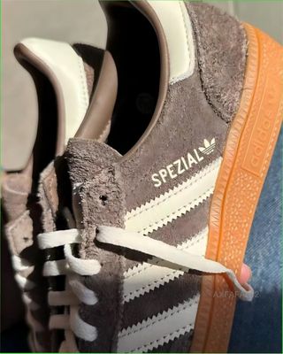 Zapatillas Adidas Handball Spezial en color marrón y beige. - Exterior de ante. - Detalle de las tres rayas. - Suela de goma.
