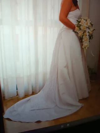Elegante vestido de novia con cola y de corte palabra de honor, ajustable en la espalda.Viene con el kankan y bolero de novia con cola opcional El precio del vestido son 100 y el del bolero 50