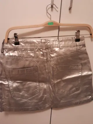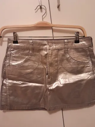 Minifalda con un llamativo acabado metalizado. - Diseño de cinco bolsillos. - Cierre de cremallera y botón. - No tiene muchas puestas. - Está en buen estado.