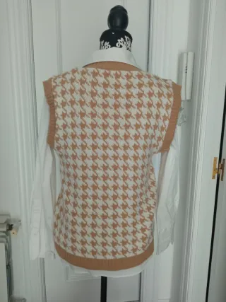 Chaleco de punto con un diseño clásico. Color Camel, la camisa no se vende - Estampado de pata de gallo. - Cuello en V.