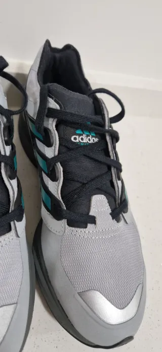 Zapatillas deportivas running Adidas con un diseño moderno y detalles en color verde azulado. Sin estrenar. Precio original 180eur. UNISEX. - Parte superior de malla transpirable. - Suela de goma para mayor tracción. - Cierre de cordones. - Logo de Adidas en la lengüeta.