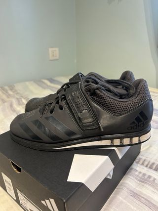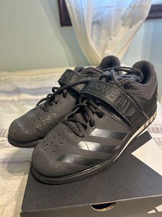 Zapatillas de powerlifting Adidas en color negro. Diseñadas para ofrecer estabilidad y soporte. - Cierre de velcro. - Suela plana y rígida. - Diseño con tres bandas. - Detalle de perforaciones en la puntera.