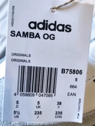 Zapatillas Adidas Samba OG en talla 38. Un clásico atemporal con un diseño icónico. - Combinación de colores blanco y gris. - Detalles de las tres rayas negras.