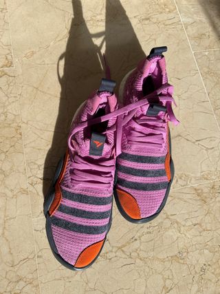 Zapatillas de baloncesto Adidas para mujer en color rosa. - Diseño con detalles en naranja. - Rayas grises en el lateral.
