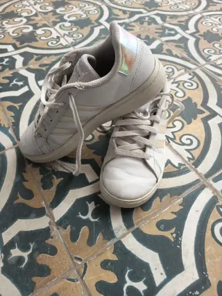 Zapatillas deportivas Adidas en color blanco con detalles plateados. - Diseño con las icónicas tres rayas. - Cierre con cordones. Casi nuevas, usadas unas 3 veces.
