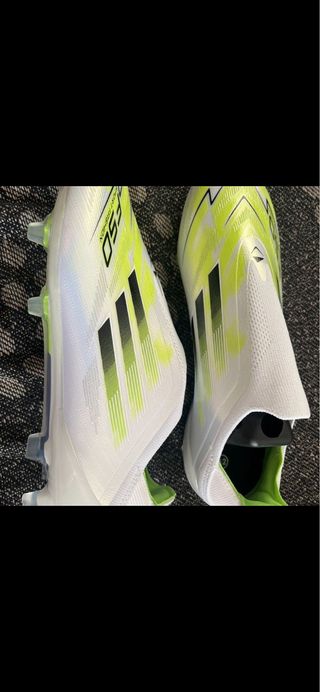 Zapatillas de fútbol Adidas con un diseño llamativo. - Combinación de colores blanco y verde neón. - Detalles de las tres rayas icónicas de Adidas.