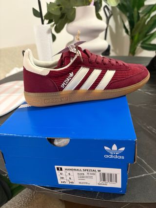 Zapatillas Adidas Spezial en color rojo y blanco. Un clásico con un diseño atemporal. - Parte superior de ante y tejido acanalado. - Suela de goma. - Detalle de las tres rayas blancas.