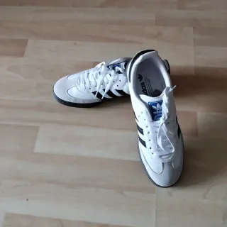 Zapatillas Adidas Samba, un clásico atemporal. - Diseño icónico con las tres rayas. - Combinación de blanco y negro. - Suela de goma. - Detalle dorado en el lateral.