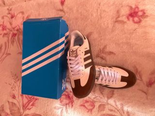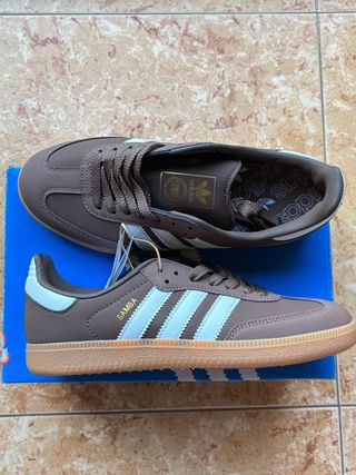 Adidas Samba Talla 39✅ Nuevas sin estrenar 🆕 Entrega rápida en 12/24h 💨 Factura Disponible 🧾 - Combinación de colores marrón y blanco. - Detalle de las tres franjas icónicas de Adidas.