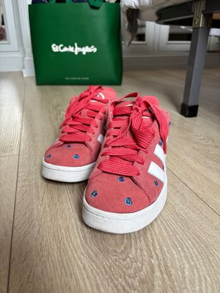 Zapatillas deportivas Adidas Campus en color rojo, con un diseño floral bordado. - De ante. - Detalle de tres rayas blancas. - Cierre con cordones.