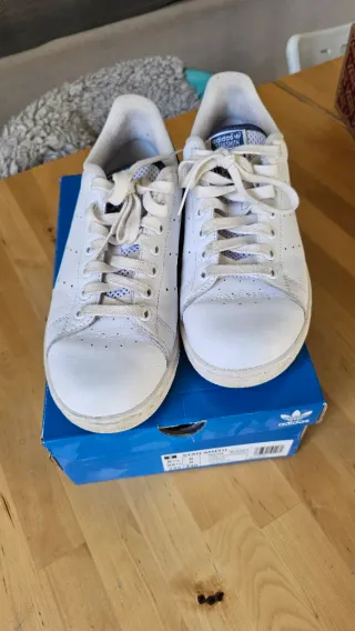 Zapatillas deportivas Adidas Stan Smith de estilo clásico. - Exterior de cuero blanco. - Detalle azul en el talón. La talla es 39 1/3. Está como nueva, usada muy poco, las vendo porque me equivoqué de talla y me van grandes.