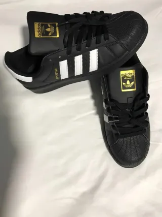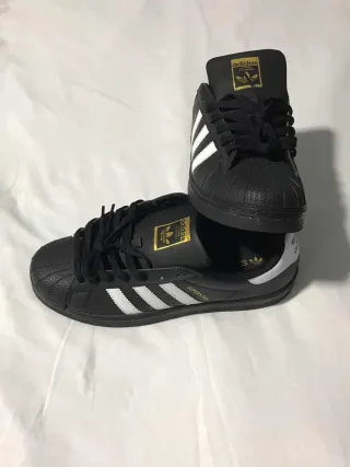 Zapatillas Adidas Superstar clásicas en blanco y negro. Un diseño icónico que combina estilo y comodidad. - Cierre con cordones. - Tres rayas características de Adidas en los laterales. - Detalle de concha en la puntera.