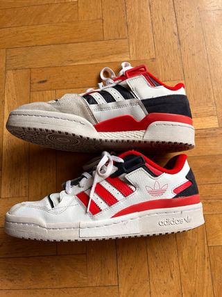 Zapatillas Adidas Forum Exhibit Low con un diseño deportivo y moderno. Combinan detalles en rojo y blanco con toques negros. - Cierre con cordones. - Detalle de las tres rayas icónicas de Adidas. - Logo de Adidas en el lateral.