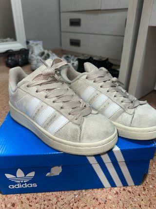 Zapatillas Adidas Campus en color beige y blanco. Un clásico para el día a día. - Diseño icónico de tres rayas. - Materiales de ante y cuero.