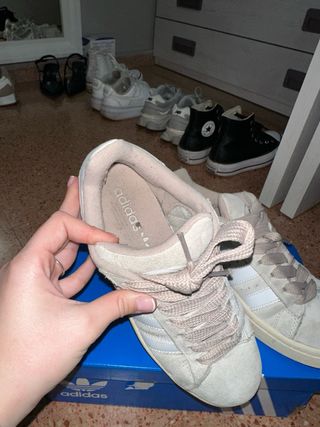 Zapatillas Adidas Campus con un diseño único. Perfecto estado. También repuesto de cordones normales. - Cordones gruesos estilo cuerda. - Detalle de las tres rayas blancas. - Logo de Adidas en la lengüeta.