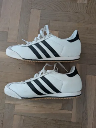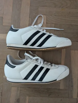 Zapatillas deportivas Adidas K74 de estilo vintage. - Diseño clásico en blanco y negro. - Suela de goma. - Cordones blancos.