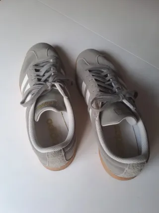 Zapatillas Adidas Samba Vega en talla 38. Un clásico con un diseño atemporal. - Combinación de blanco y gris. - Detalles de las tres franjas negras.