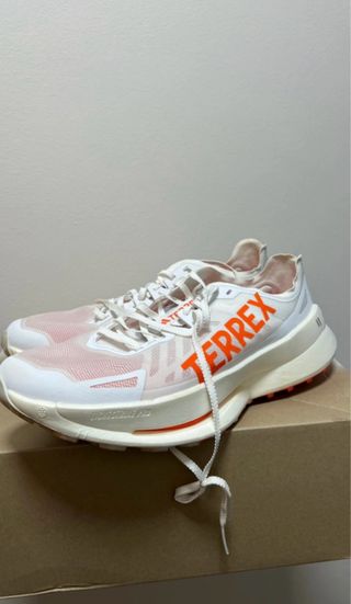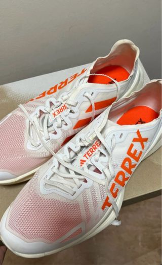 Zapatillas de running Adidas Terrex Speed Ultra en color blanco y naranja. - Diseño ligero y transpirable. - Suela con buen agarre para terrenos variados. - Ideales para trail running.