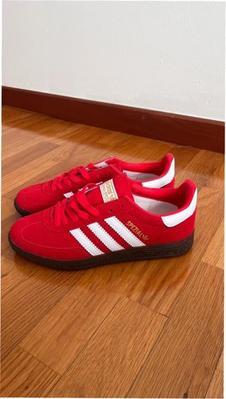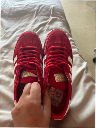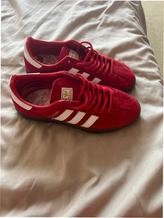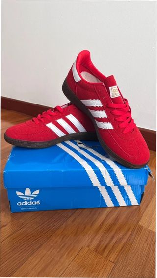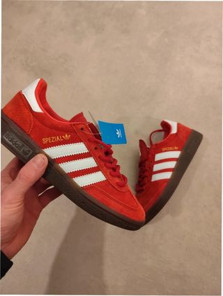 Zapatillas Adidas Handball Spezial en color rojo y blanco. Un clásico para tu día a día. Tengo factura de la Adidas. - Parte superior de ante y cuero. - Suela de goma. - Detalle de las tres rayas blancas.