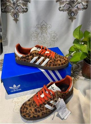 Zapatillas Adidas Samba OG con un llamativo estampado de leopardo. - Diseño clásico con las tres rayas blancas. - Cordones naranjas vibrantes. - Detalle de cuero blanco en el talón.