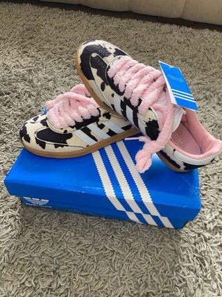 Zapatillas Adidas Samba con un diseño único de estampado de vaca y cordones rosas. - Estampado de vaca en blanco y negro. - Cordones de pelo sintético en color rosa. - Suela de goma. - Detalle de las tres franjas.