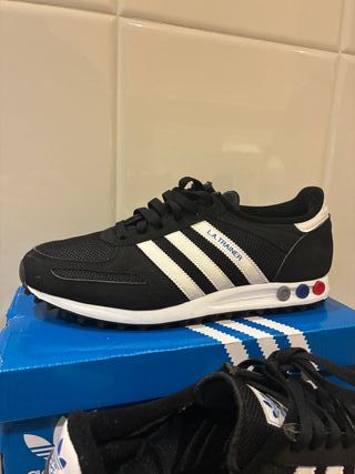 Zapatillas Adidas LA Trainer en talla 43. Puestas 2 veces. - Diseño clásico en negro y blanco. - Detalles de tres rayas icónicas. - Suela con pines de ajuste de amortiguación.