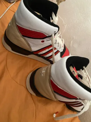 Zapatillas altas Adidas Rivalry Hig en color rojo y blanco. Un clásico para tu colección. - Diseño de caña alta. - Cierre con cordones. - Detalles de las tres rayas. - Paneles laterales en color dorado. Precio negociable (el precio original está en 120) Si no se responde por aquí escribir al 681969178