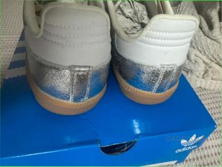 Zapatillas Adidas Samba OG en color plata y blanco. Suela de goma. - Diseño clásico. - Cierre de cordones. - Logo de Adidas en la lengüeta y el talón.
