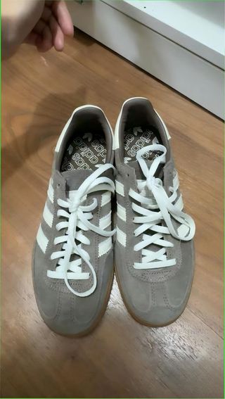 Zapatillas Adidas Handball Spezial en color marrón y blanco. Un clásico del diseño deportivo. - Exterior de ante. - Suela de goma. - Detalle de las tres rayas icónicas.