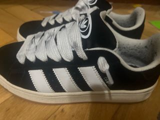Zapatillas deportivas Adidas Campus en color negro con detalles blancos. - Diseño clásico de Adidas. - Tres rayas blancas laterales. - Logo de Adidas en la lengüeta y el talón. Cordones un poco sucios Si las quieres establezcan conversación cuanto antes